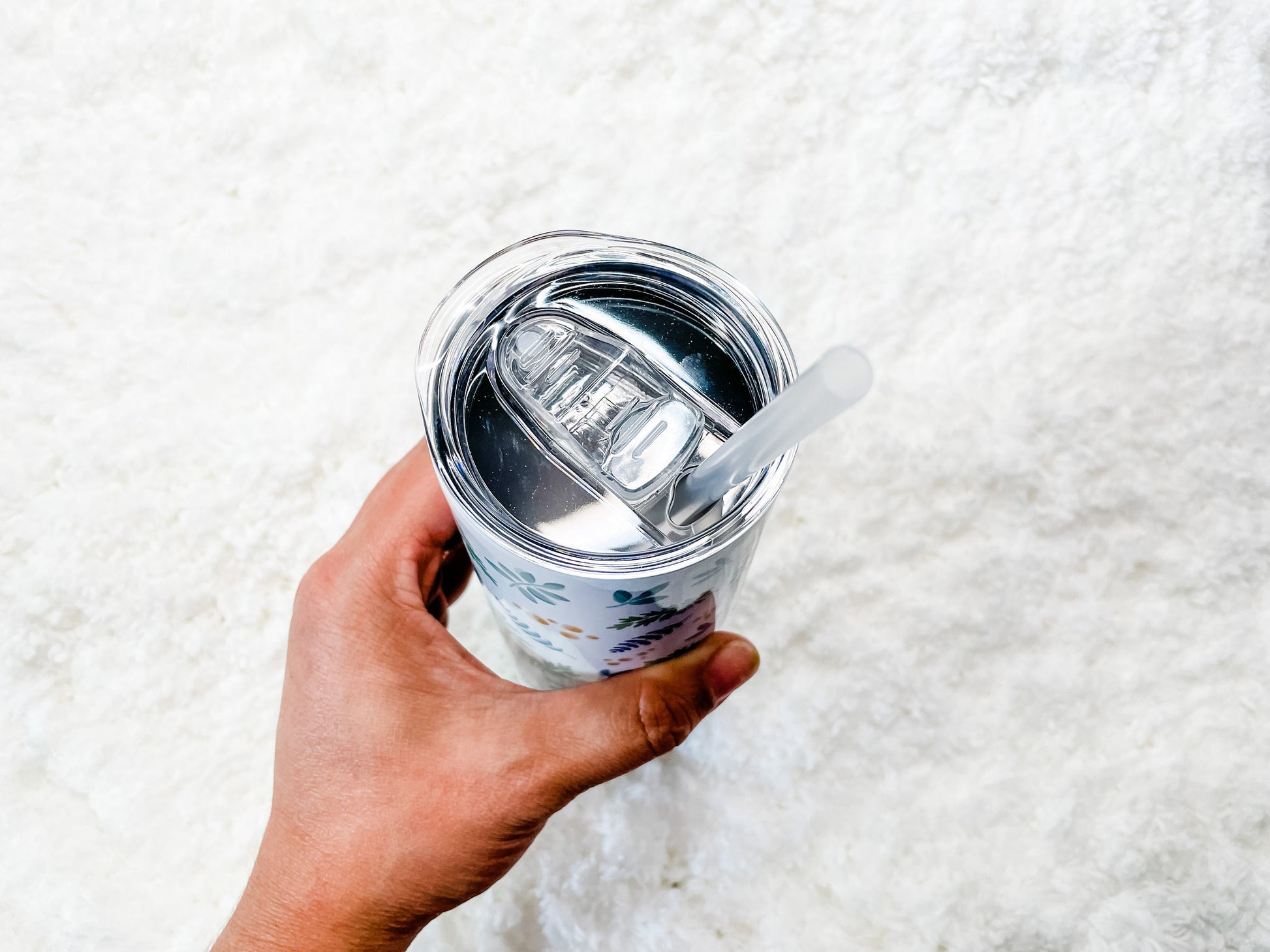 - The large tumbler is 20 oz, double insulated with a plastic slide top lid and comes with your choice of silver metal straw or hard plastic straw with a stopper bottom (to prevent the straw from coming out of the slider lid)