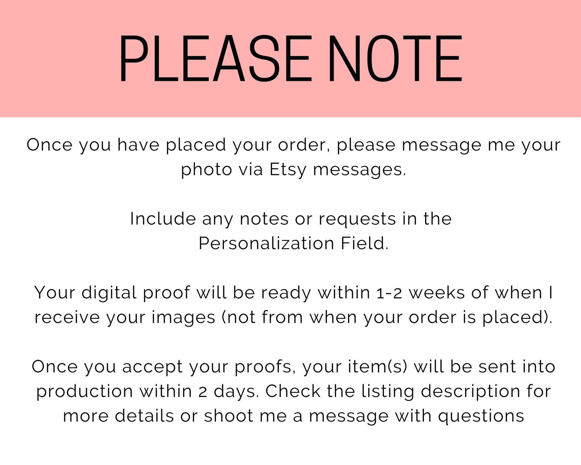 • A proof will be sent to you via Email for each image/item you have purchased. I will gladly make edits (within reason) until you are happy with the layout and image.