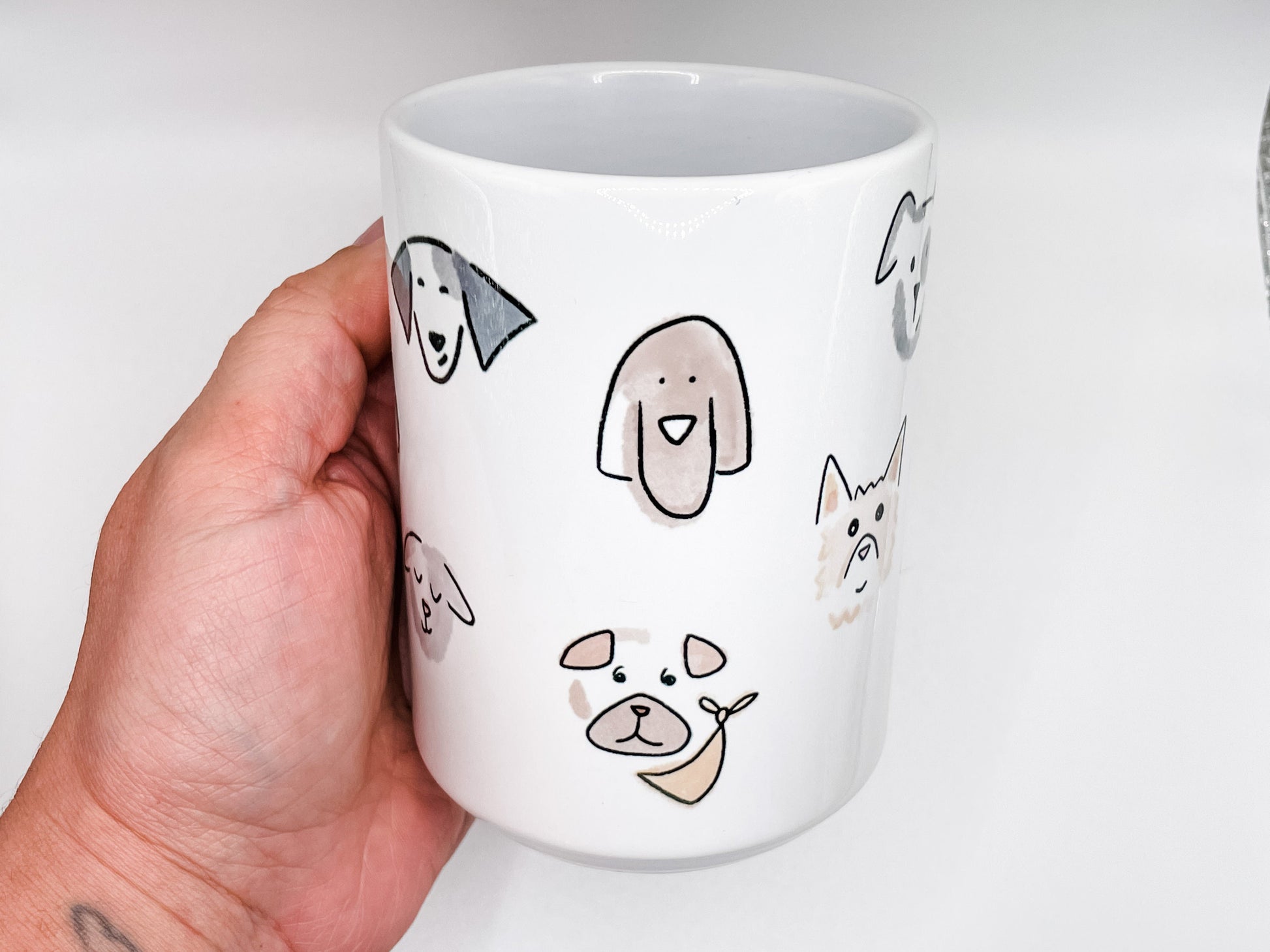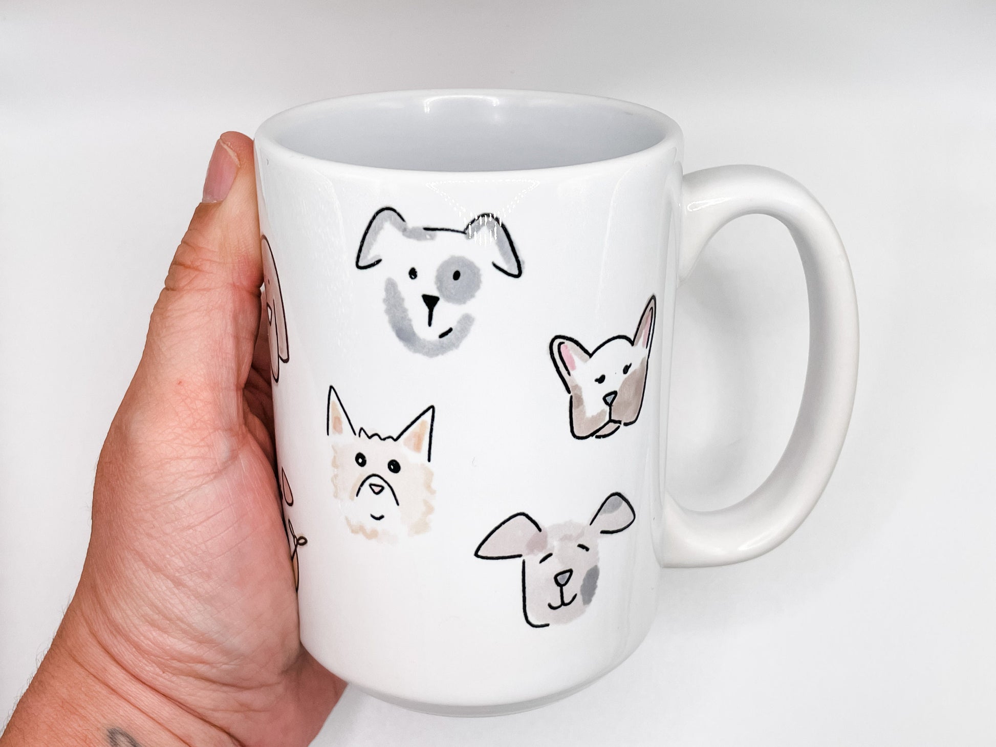 All images in my shop are original and hand-drawn by the shop owner! This wrap around Doggie (dog) Faces design features several different dog breed illustration images around the mug. These mugs are hand-decorated by the shop.