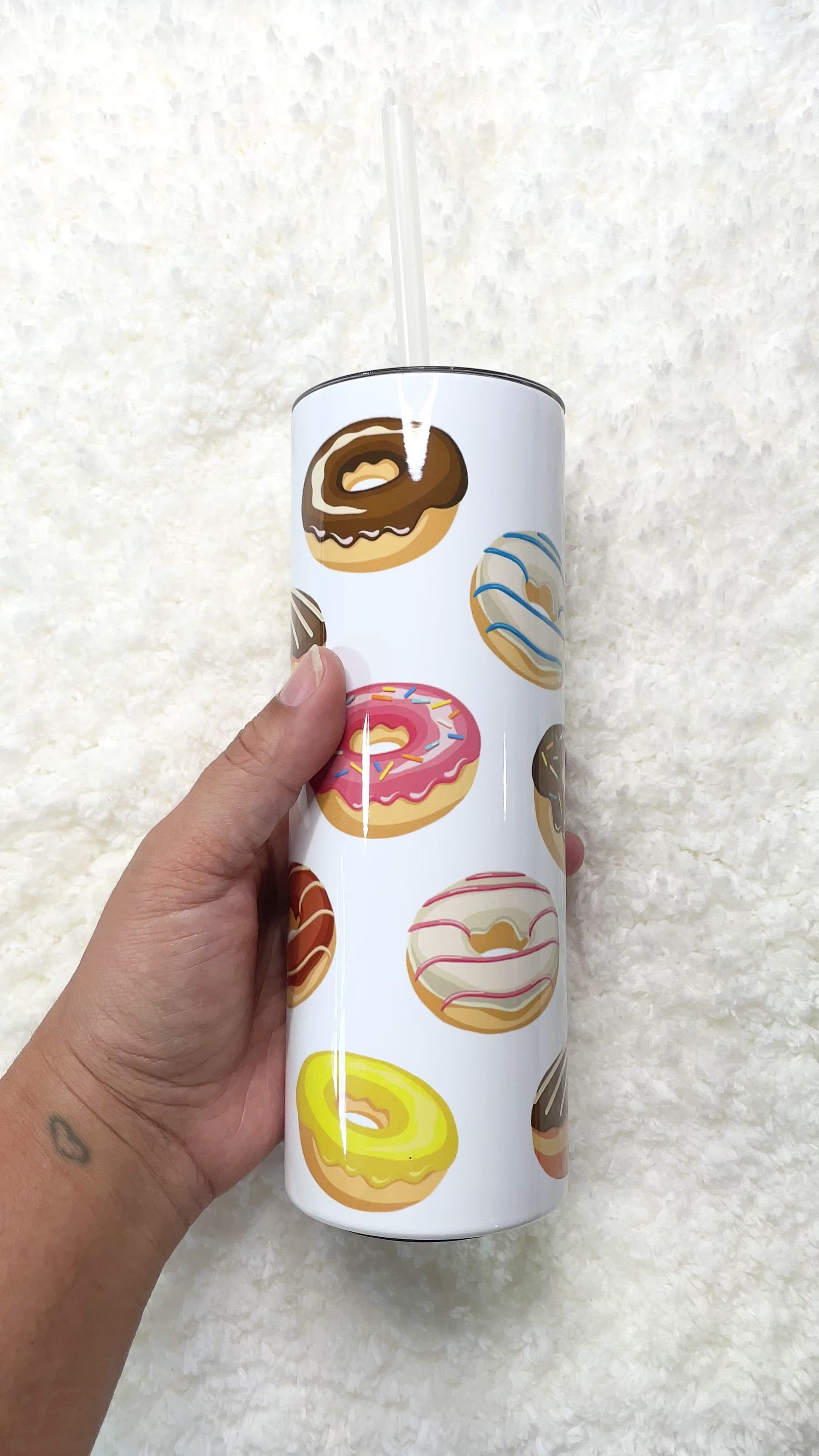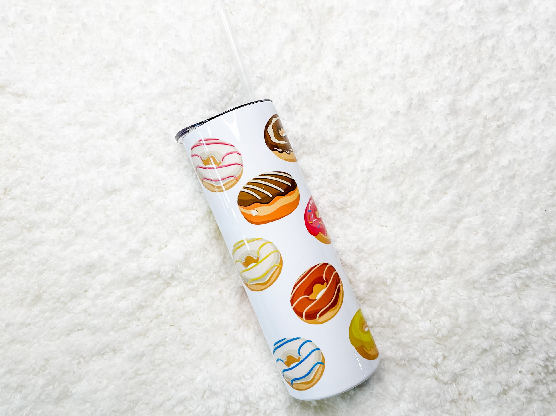 This fun Tumbler features hand-drawn colorful doughnuts. This is original artwork created by the shop owner. The pattern features lots of illustrated doughnuts as a full-wrap, no-seam design.