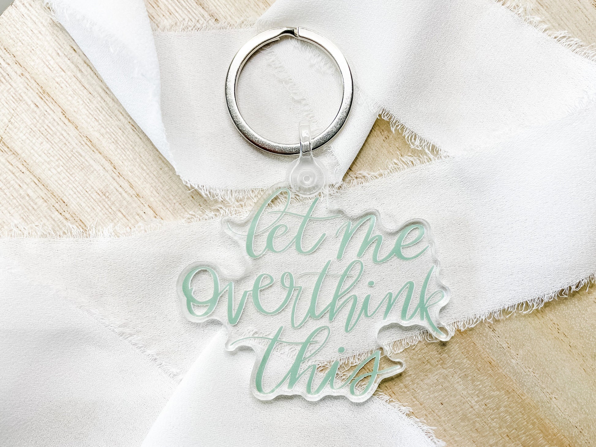 Overthinkers unite! This keychain features a hand-lettered "Let me overthink this" phrase.