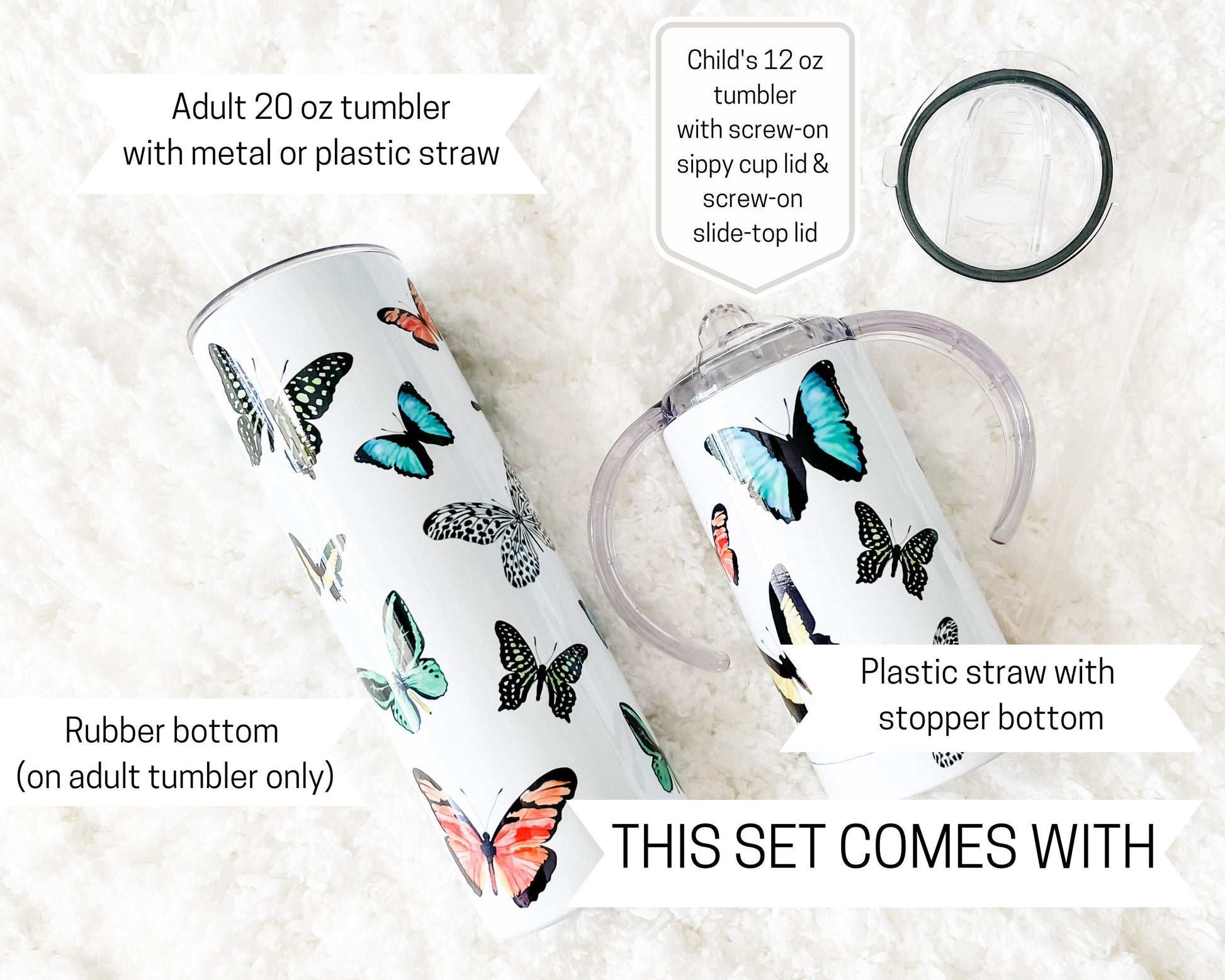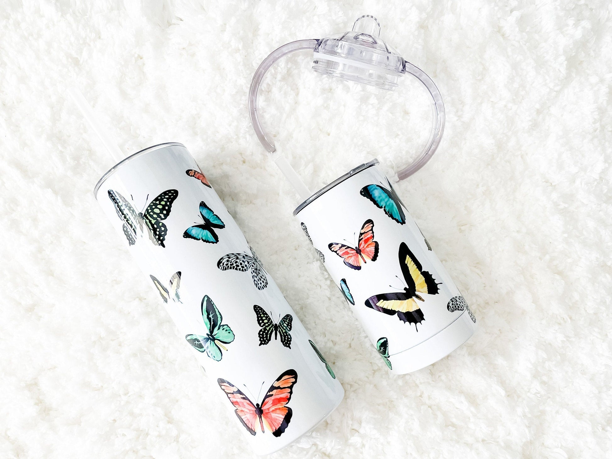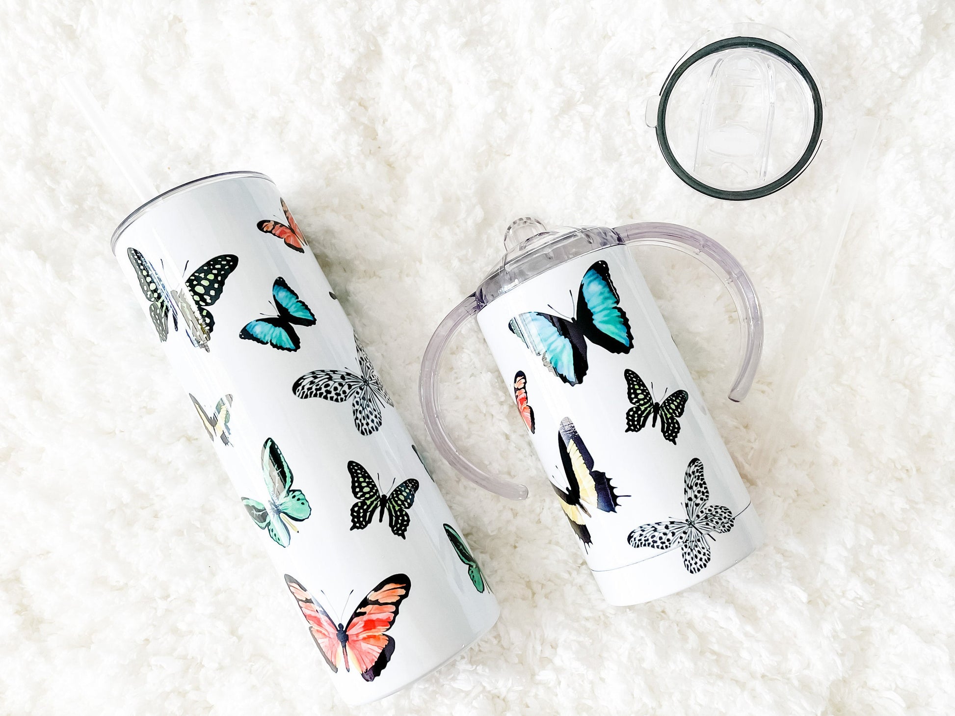 Matching Mama and Baby or Mama and Mini Tumbler set! This beautiful watercolor style Tumbler set features several colorful hand drawn Butterflies. The pattern creates a full-wrap, no-seam design.