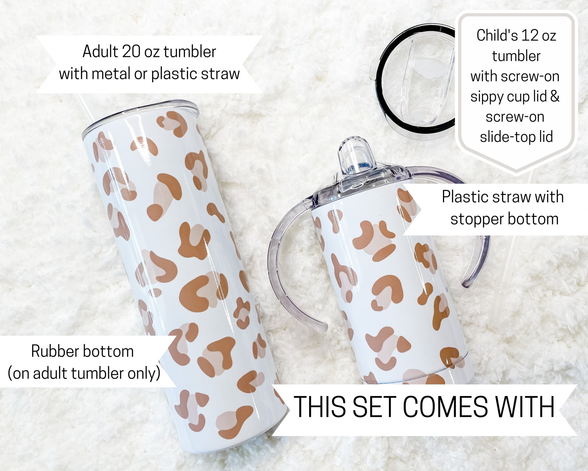 - The small tumbler is 12 oz, double insulated and comes with both a slow-flow sippy cup lid and a slide top lid with a plastic straw with stopper end (to stop the straw from being pulled out from the top). This grows with the child and allows for use for many years!
