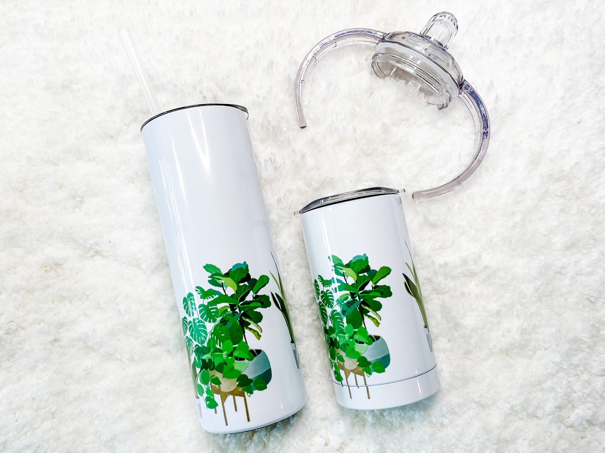 Matching Mama and Baby or Mama and Mini Tumbler set! This Tumbler set features several hand-drawn Plant illustrations; Fiddle Fig, Dieffenbachia, Snake Plant, Monstera, and Pothos. The pattern creates a full-wrap, no-seam design.