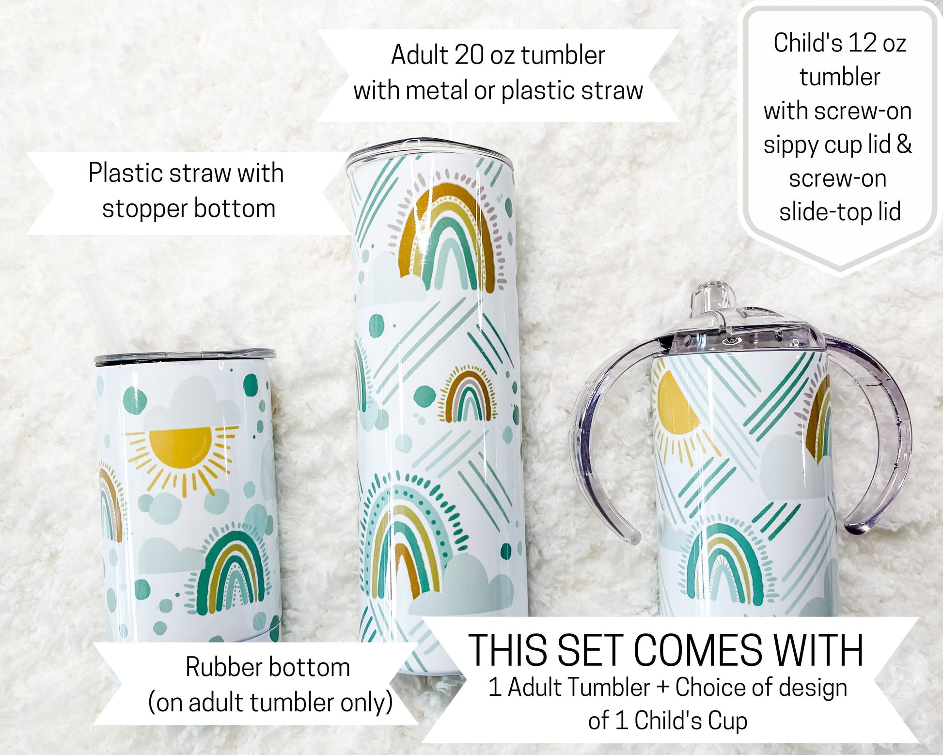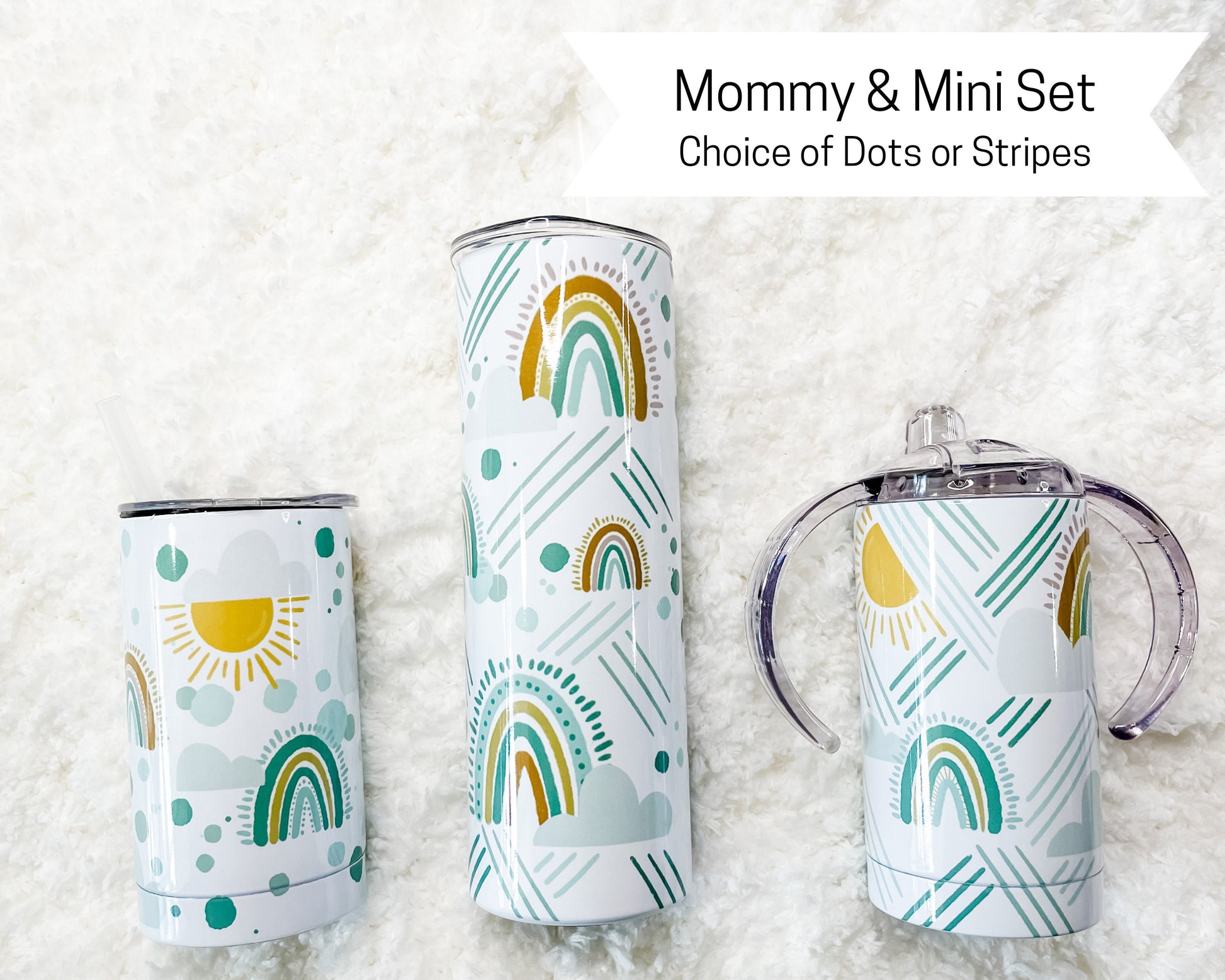 Matching Mama and Baby or Mama and Mini Tumbler set! This Tumbler set features an Adult tumbler in the rainbow print with dots & stripes + your choice of 1 child's cup either in the dots print or stripes print kids cup. The pattern creates a full-wrap design. Additional cups may be added on for other children or adults from the listings linked below.