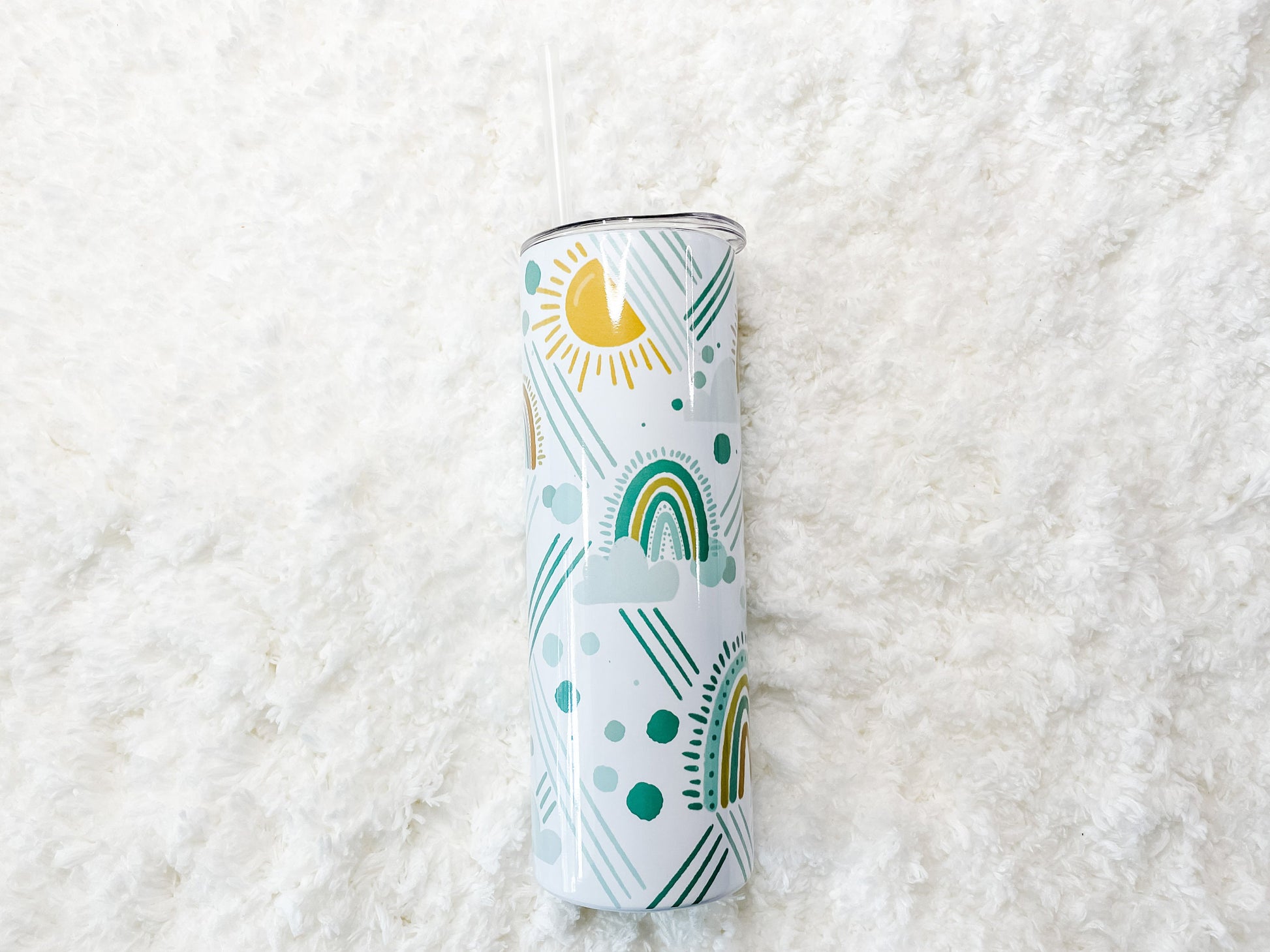 This sweet Tumbler features hand-drawn Rainbow illustrations with dots and stripes. This is original artwork created by the shop owner. The pattern features a white background with illustrated rainbows as a full-wrap no seam design.
