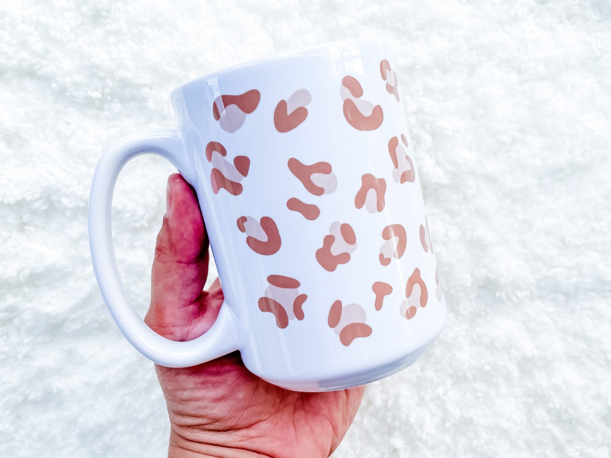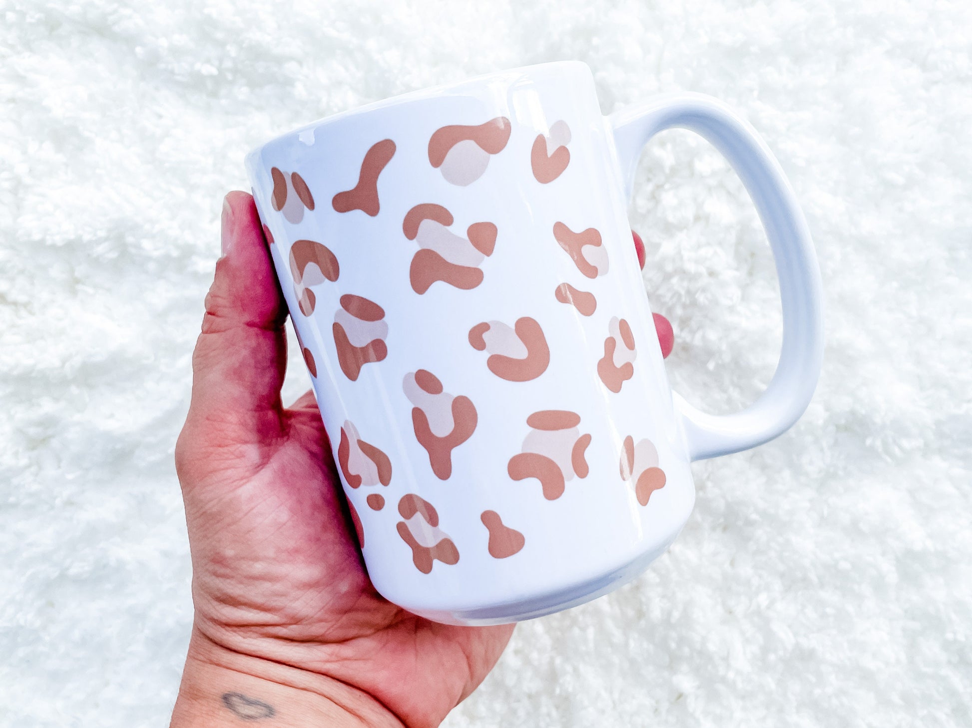 All images in my shop are original and hand-drawn by the shop owner! This Leopard print design has a white background with colorful Leopard spots in a wrap-around design around the mug. These mugs are hand-decorated by the shop.