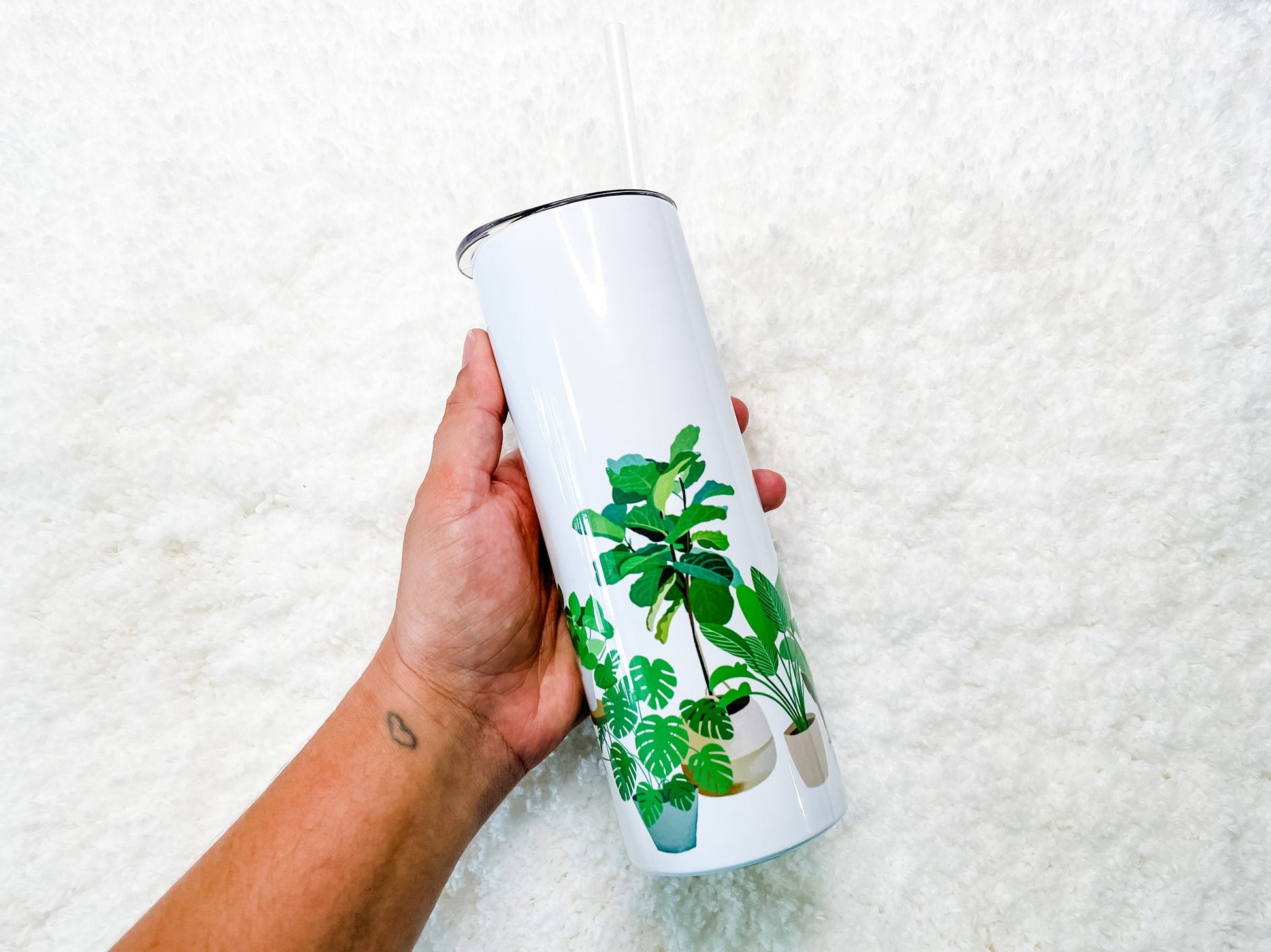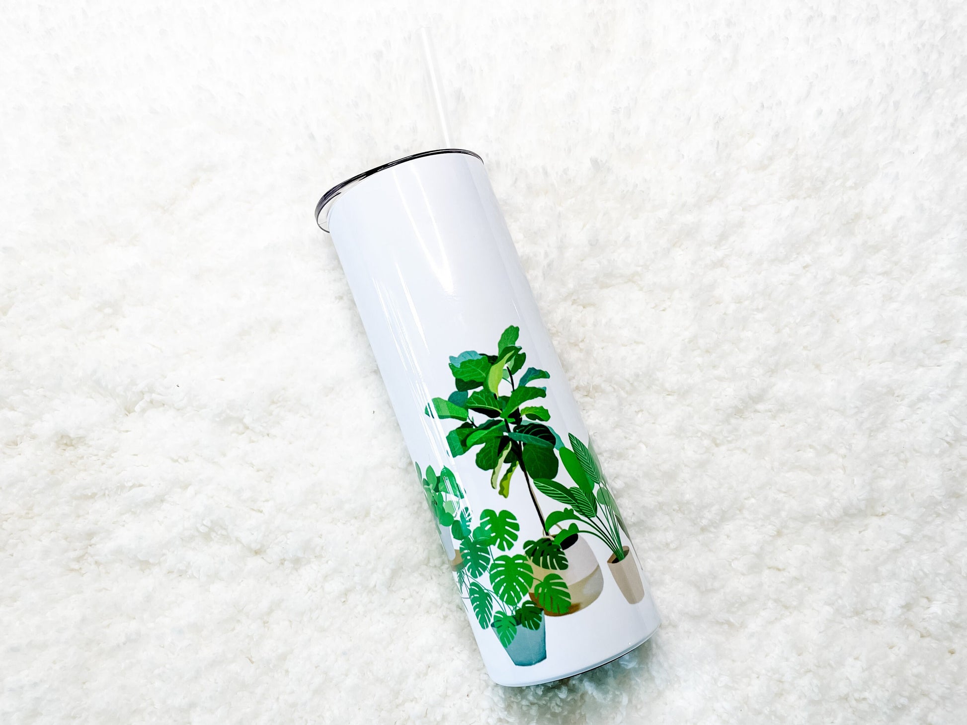 This Tumbler features hand-drawn vibrnat plant illustrations with Fiddle Fig Plant, Dieffenbachia, Snake Plant, Monstera, and Pothos Plants . This is original artwork created by the shop owner. The pattern features a white background with illustrated plants as a full-wrap no-seam design.
