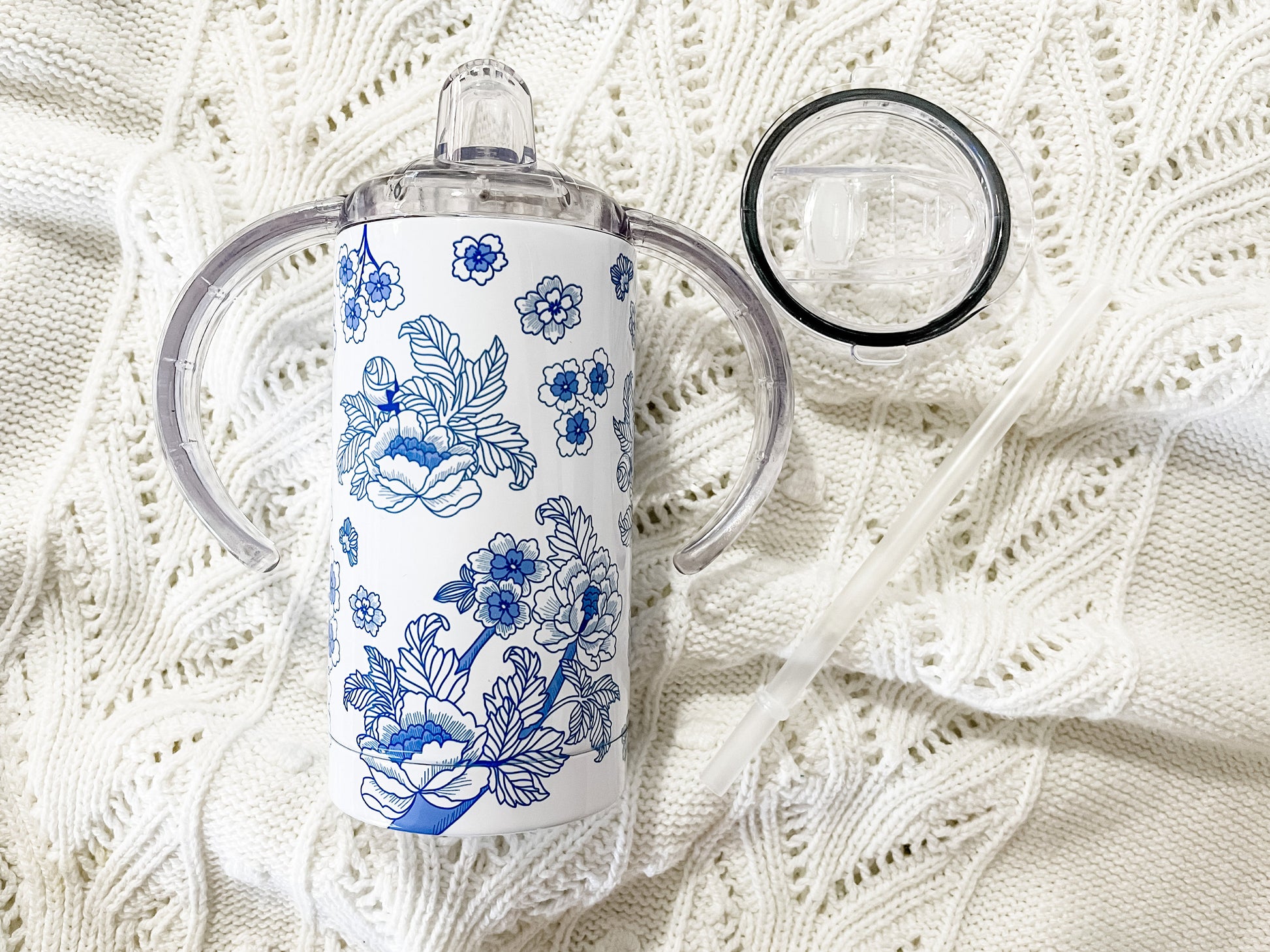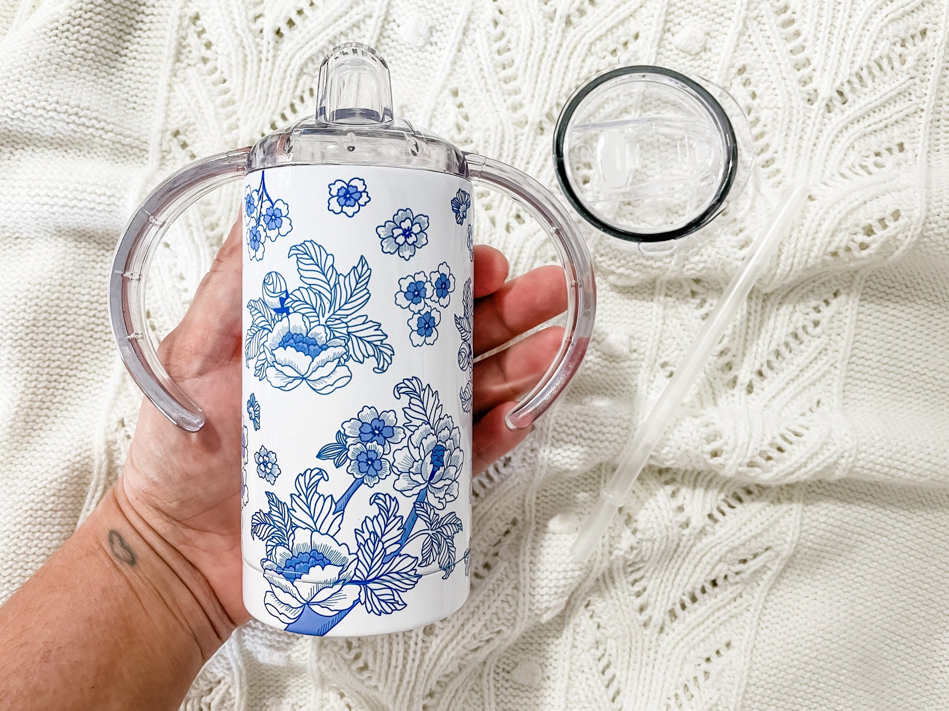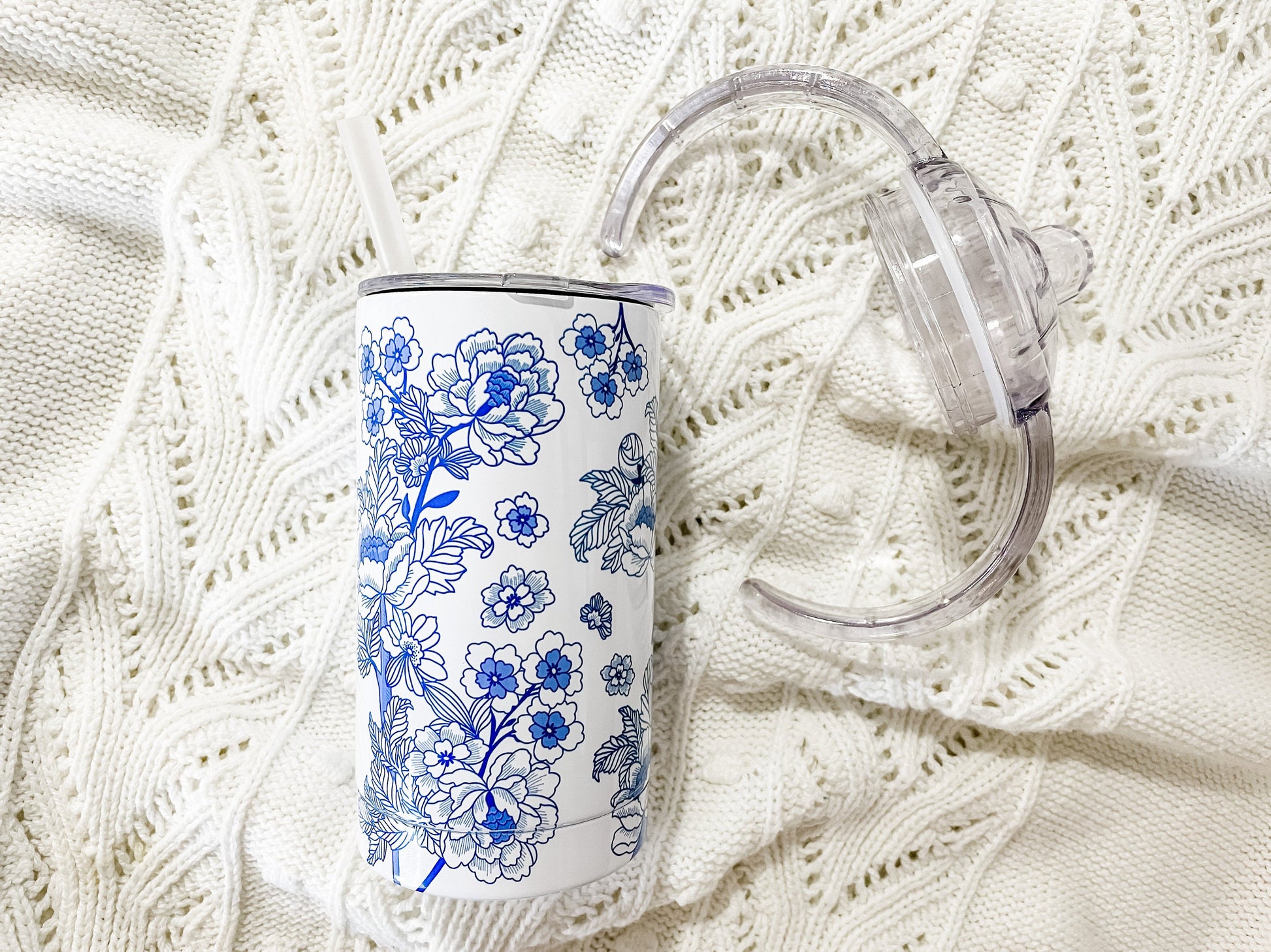 Looking for a chic child's sippy cup that looks good and will last while your child grows? This hand-drawn Chinoiserie-style blue and white art is original artwork created by the shop owner. The pattern features a leaf and flower branch pattern as a full-wrap design. Please note that colors may vary due to screen variations.