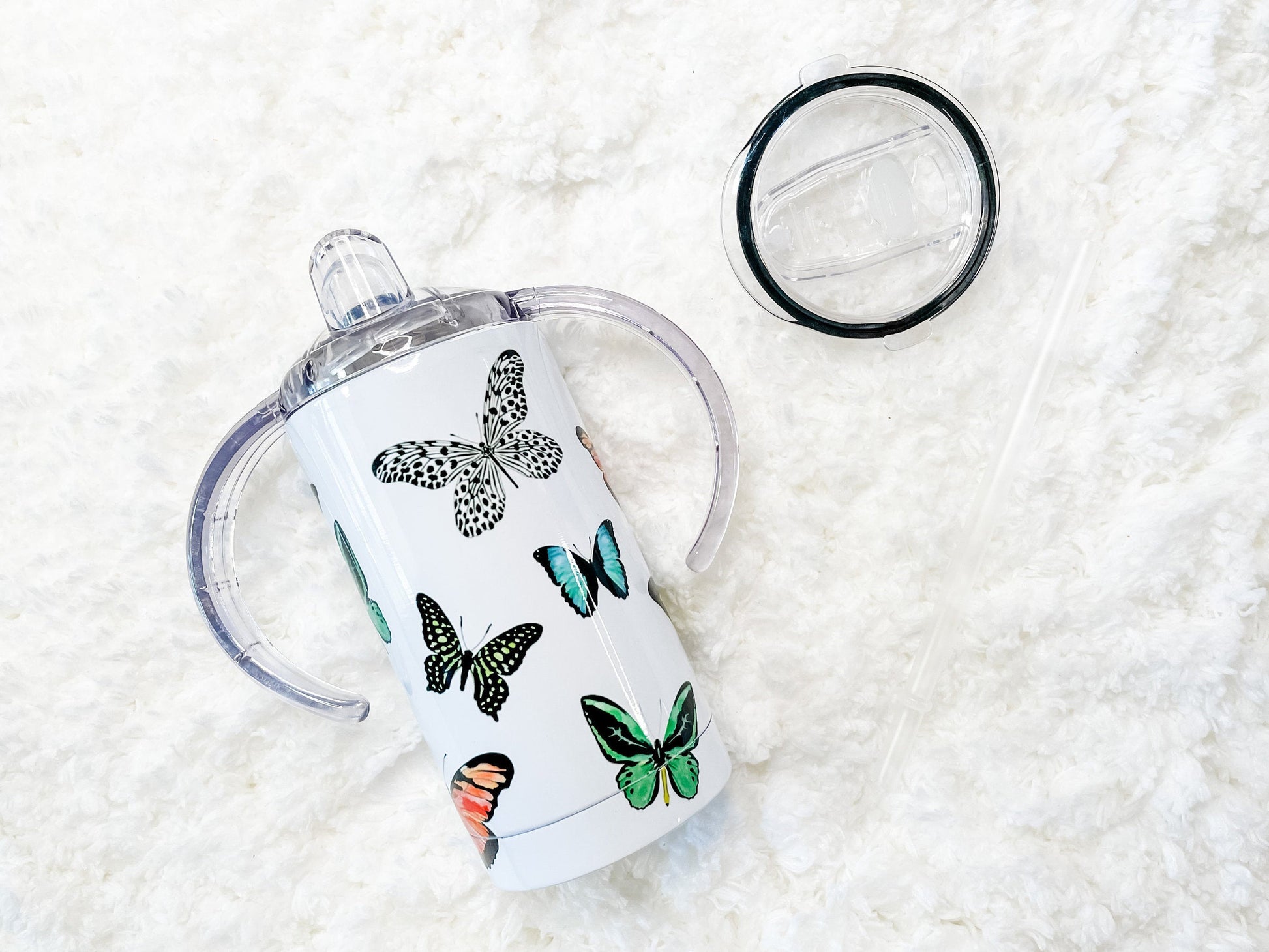 Looking for a chic child's sippy cup that looks good and will last while your child grows? This beautiful watercolor style Butterfly design Tumbler features hand drawn colorful butterflies. The pattern creates a full-wrap, no-seam design.