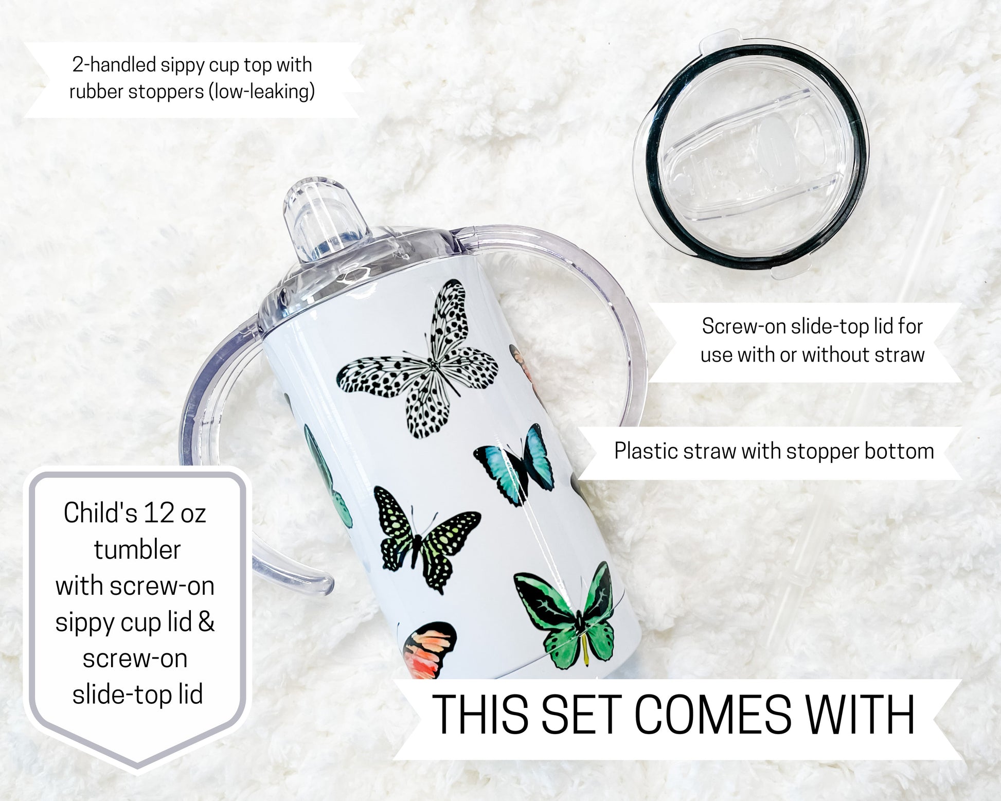 - This tumbler is 12 oz, double insulated and comes with both a slow-flow sippy cup lid and a slide top lid with a plastic straw with stopper end (to stop the straw from being pulled out from the top). This grows with the child and allows for use for many years!