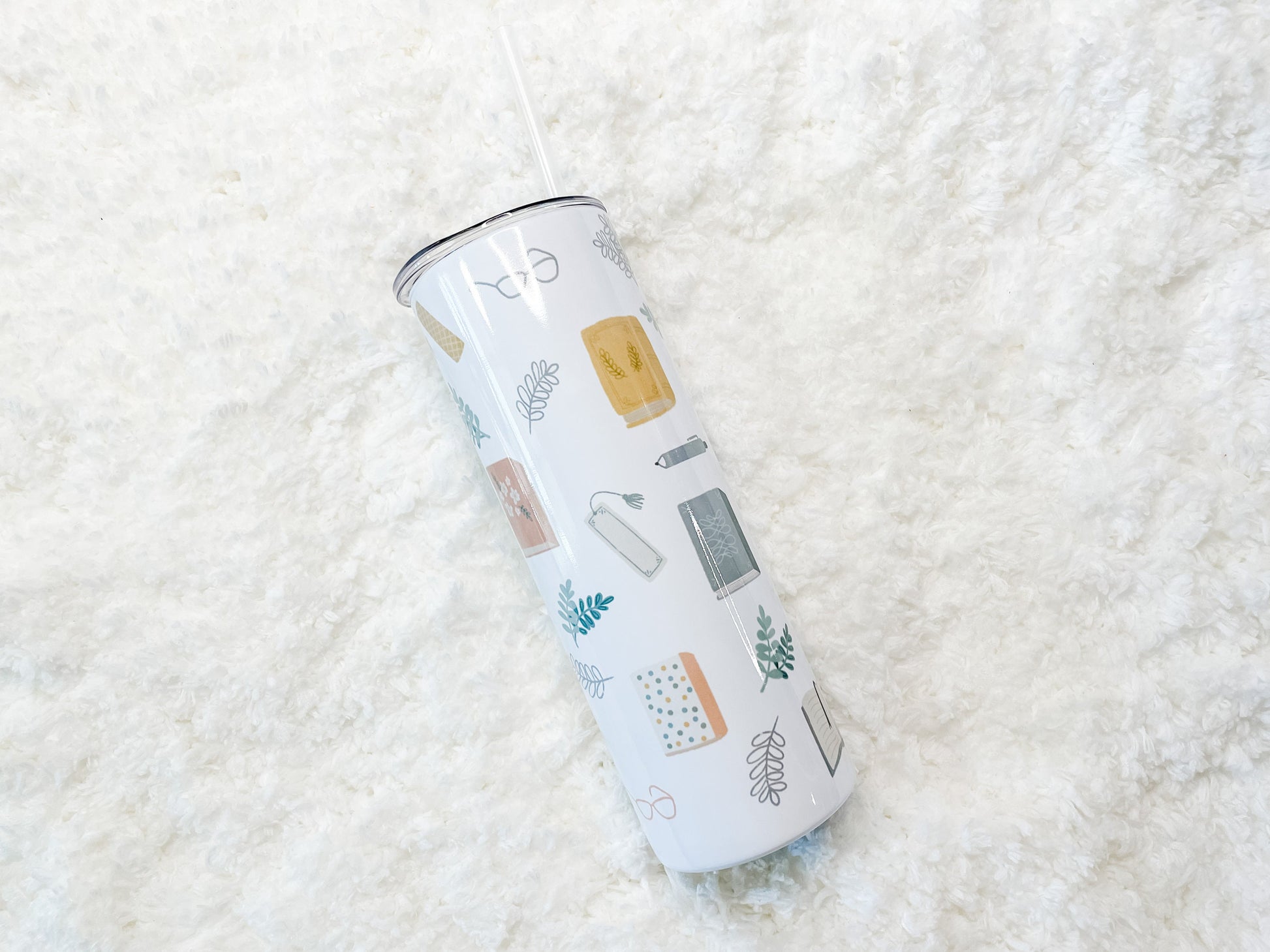 This sweet Tumbler features hand-drawn Book and book-related illustrations. This is original artwork created by the shop owner. The pattern features a white background with illustrated books, bookmarks and glasses as a full-wrap no seam design.