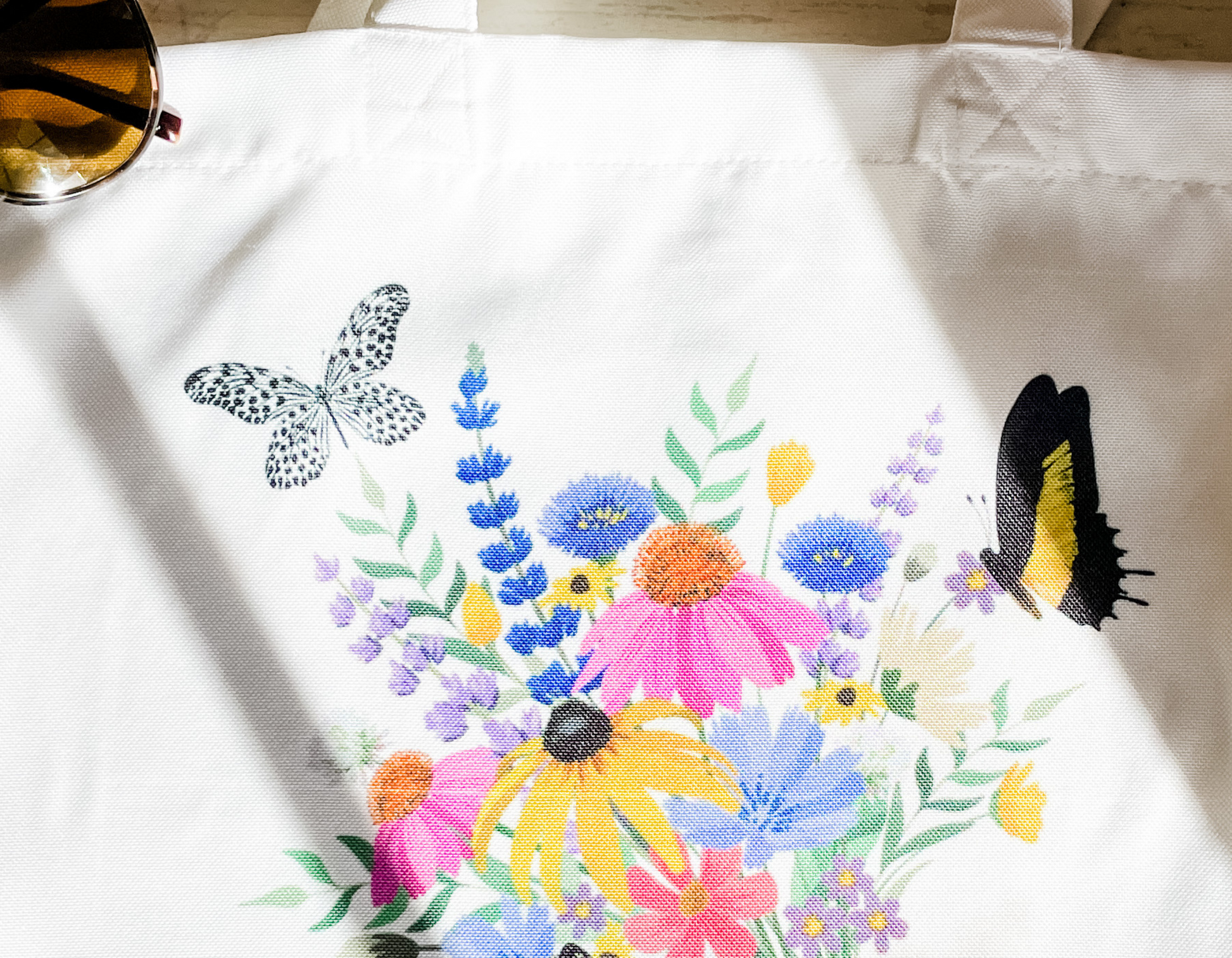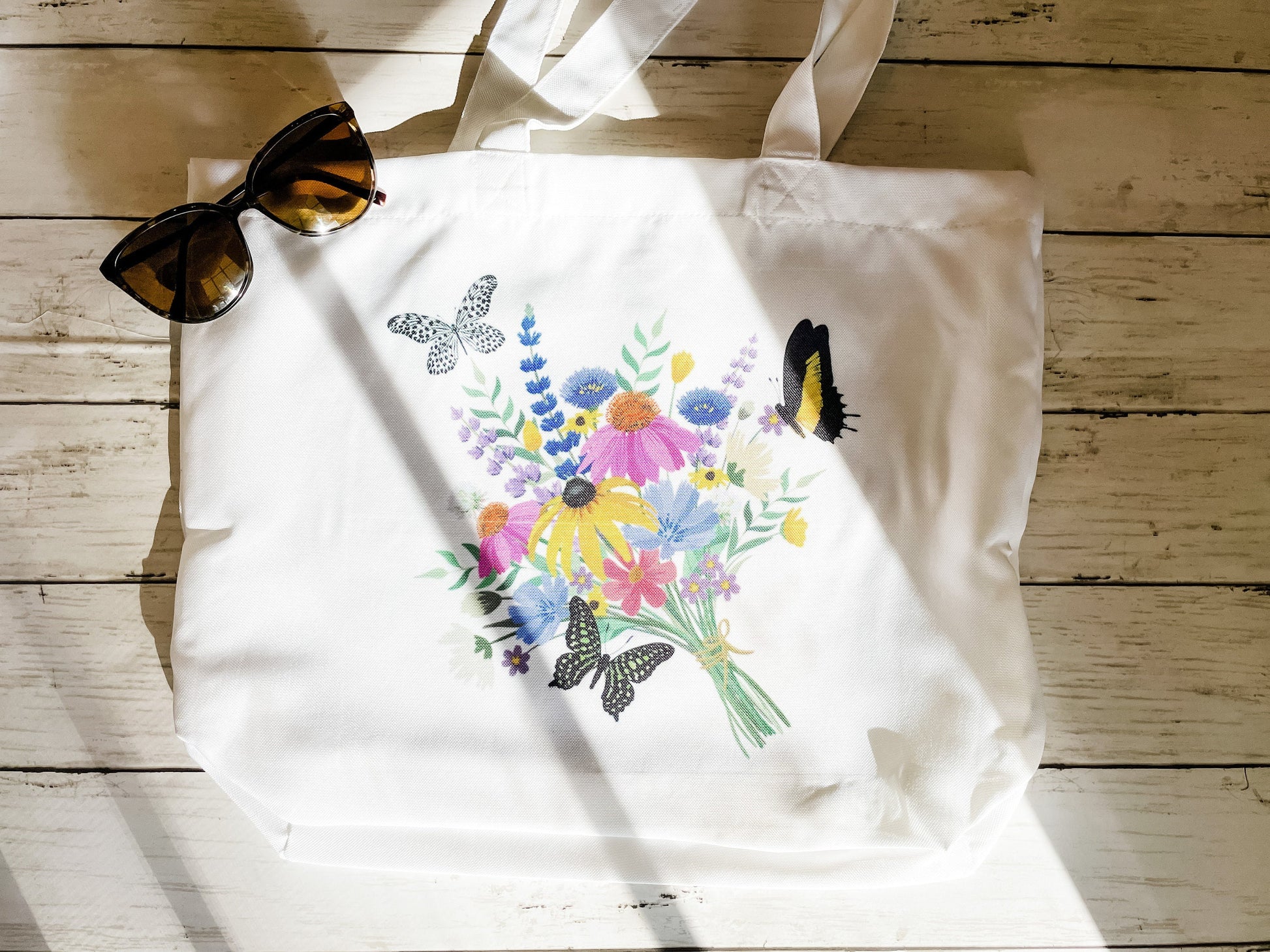 All images in my shop are hand-drawn and original! Enjoy your one-of-a-kind items and prints or enjoy gifting them to others. This tote bag features a colorful wildflower bouquet with butterflies, perfect for the upcoming outdoor market and shopping season.